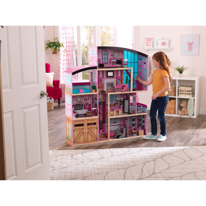 La maison de poupée Shimmer de KidKraft est la maison de poupée idéale pour que les jeunes imaginations puissent tisser leurs propres histoires pour les poupées de 12 pouces. La maison de poupée lumineuse à quatre niveaux mesure plus de 1,50 m de haut et est richement détaillée avec des lumières fonctionnelles et des toilettes à chasse d'eau. Pour une touche personnalisée, les enfants peuvent monter un miroir encadré sur le mur ou insérer leurs propres œuvres d'art pour les exposer fièrement dans cette grande maison de poupée. Chacune des neuf pièces offre une toile de fond unique pour toutes sortes d'histoires. Un élégant ascenseur rose monte en douceur sur trois étages jusqu'au bureau, où un spa sur balcon attenant les attend. Un escalier moderne mène à la mezzanine imposante de la chambre pour une vue à couper le souffle pour toutes les poupées. Le kit d'accessoires de 30 pièces comprend des meubles en bois peints à la main et des accessoires pour une vie saine. Un tapis de yoga et un tapis roulant permettent des cours d'exercices amusants dans la salle de sport tout en regardant la télévision à écran plat moderne. Il y a même un bol de salade fraîche qui attend sur la table. En pratiquant une vie saine avec leurs poupées de 12 pouces, les enfants apprendront des leçons sur l'importance d'un mode de vie équilibré.