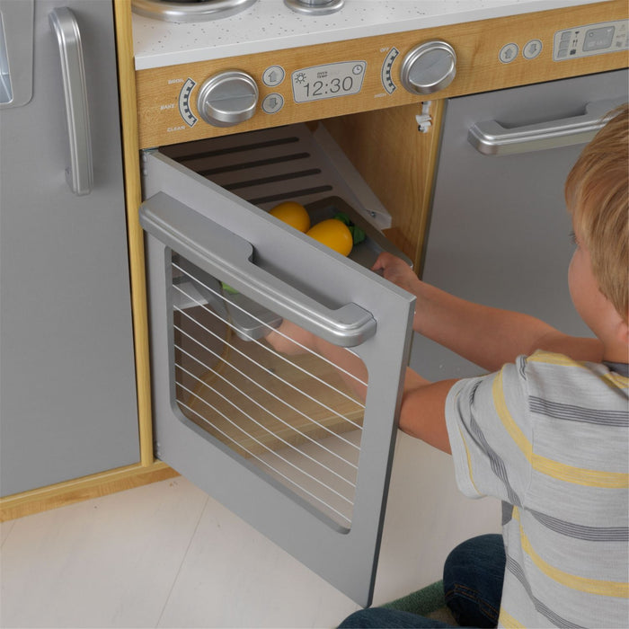 Il est temps de cuisiner un peu de plaisir ! Notre cuisine de jeu KidKraft Uptown Natural a un look branché et moderne que les jeunes chefs adoreront à coup sûr. Avec un dosseret en carrelage et des comptoirs élégants, le design s'inspire des cuisines tendance de la vie réelle. Chaque appareil est interactif, y compris les portes qui s'ouvrent et se ferment, les boutons qui tournent et cliquent et un tableau noir fonctionnel sur la porte du congélateur. Les enfants adoreront prendre des appels sur le téléphone de jeu sans fil qui se fixe sur le côté du réfrigérateur. Gardez tous les accessoires bien rangés et à portée de main grâce aux crochets pour suspendre les ustensiles et au porte-serviettes latéral. Fabriquée en bois composite, la cuisine contemporaine Uptown Natural est un ajout robuste et élégant aux moments de jeu.